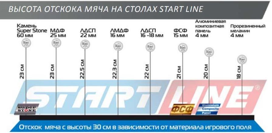 Размер теннисного стола соответствует международным стандартам. Стол укомплектован столешницей из ЛМДФ 16 мм, благодаря повышенной плотности этого материала обеспечивается лучший отскок мяча в сравнении с ЛДСП 16 мм. Новая система складывания — собственная уникальная разработка Start Line – предусматривает усовершенствованный механизм: специальные фиксаторы позволяют закреплять положение стола как в разложенном, так и в сложенном виде. А после игры стол можно компактно сложить. С такой системой складывания может легко справиться один человек.